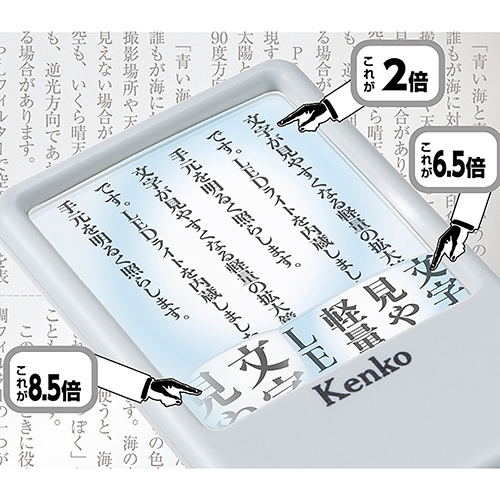 携帯に便利なカードタイプのLED付き拡大鏡。メインレンズは倍率2倍と低倍率なので、本や地図を見るのに便利です。小玉レンズは6.5倍と8.5倍と高倍率なので宝石などを見るの便利です。