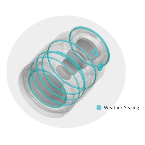 可動部各所に水滴、小雨、雪、ホコリなどからレンズを保護するウェザーシーリングを採用。