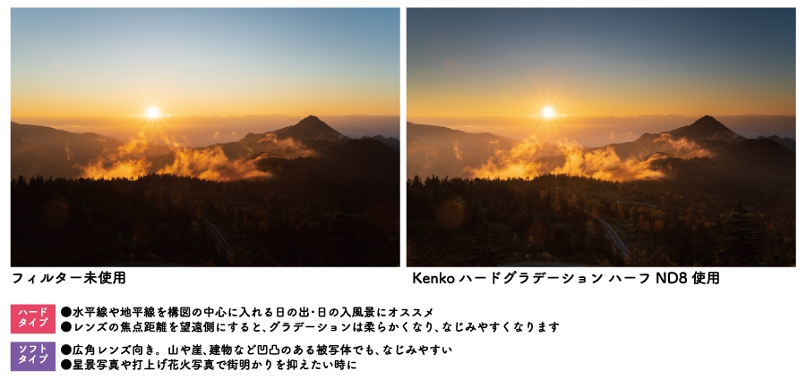 日の出・日の入前後の空と地上の明暗差を整えます。レンズに直接取付け出来るので角型フィルターより手軽に使えるのが魅力です。
