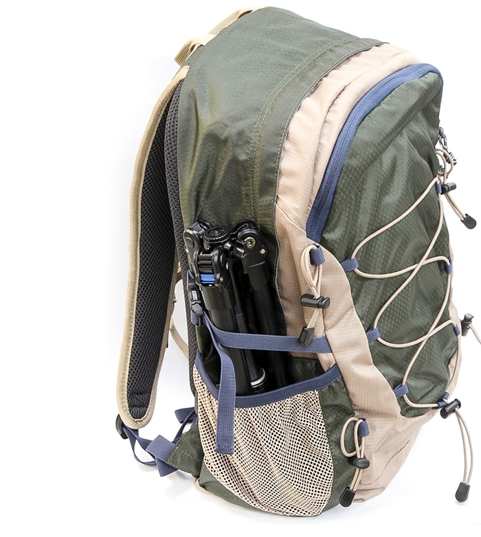 反転時の三脚の太さを市販のペットポトルと同程度としたため、写真のようなペットポトル収納ポケットのあるリュックサックに、エアリーシリーズ三脚を収納することができます。