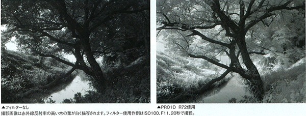 | 赤外域の透過特性を考慮した。R72専用のデジタルマルチコートを採用。 デジタルカメラ用の赤外撮影フィルター。露出の調整がむずかしい赤外撮影ですが、デジタルなら撮影画像を確認して調整、その場で再撮影が可能です。デジタル一眼レフのメーカー、機種により赤外の感光特性が異なるため、露出など実際に撮りながら調整を行なって下さい。 |