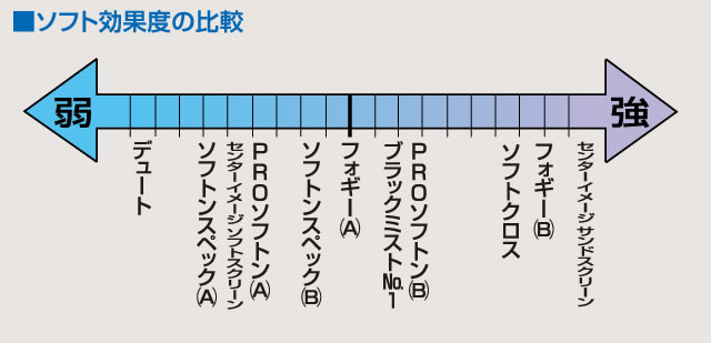 ソフト系フィルターはいろいろな種類がありますがソフト効果は それぞれ微妙に異なりますので左の図を参考にして下さい。