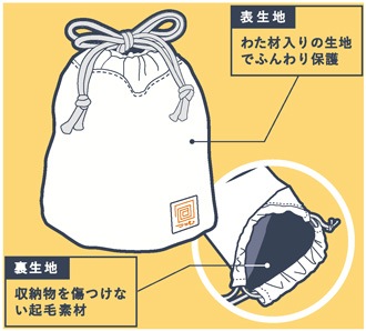さっと入れるだけ、ふんわり生地で優しく機材を包む「包(つつむ) 巾着ポーチ」