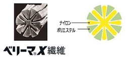 ベリーマXは、親水性ナイロンと親油性ポリエステルの複合繊維。周囲のクサビ状の部分がポリエステル、中央の放射線状の部分がナイロンです。
