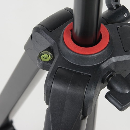雲台の基部での水平出しの目安となるように、本体部分に水準器を装備しています。 脚の長さを調整して水平を出すことで、雲台を左右に動かしても水平を保てます。