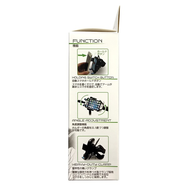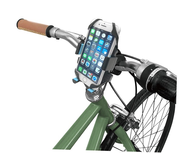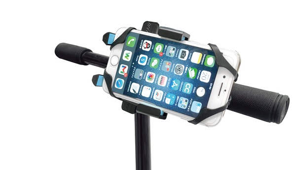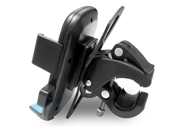 樹脂製ホルダーとシリコンバンドのダブル保持で振動に強いクッション付きスマホホルダー。