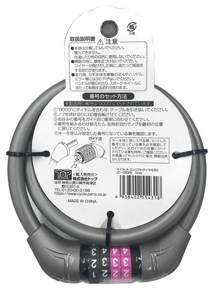 【即配】マイセットコンパクトダイヤル60 GRAY グレー TOP トップ 自転車用ワイヤー錠【ネコポス便送料無料】