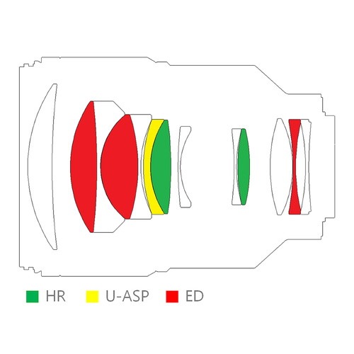 | レンズ構成 | 11群13枚(超精密非球面 1, 高屈折率 2 , EDガラス 3) |