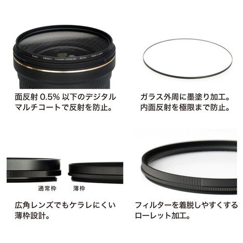 Kenkoのスタンダードなクロスフィルター3種をPRO1Dシリーズでリニューアル。「PRO1D R-クロススクリーン(W) N」は4本線、「PRO1D R-スノークロス(W)」は6本線、「PRO1D R-サニークロス(W)」は8本線のクロス効果です。