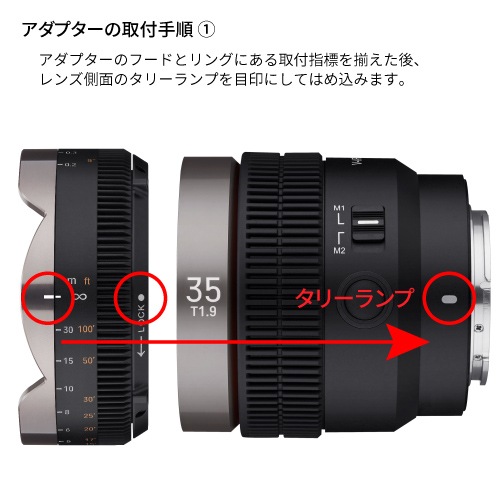 ① アダプターのフードとリングにある取付指標を揃えた後、レンズ側面のタリーランプを目印にしてはめ込みます。