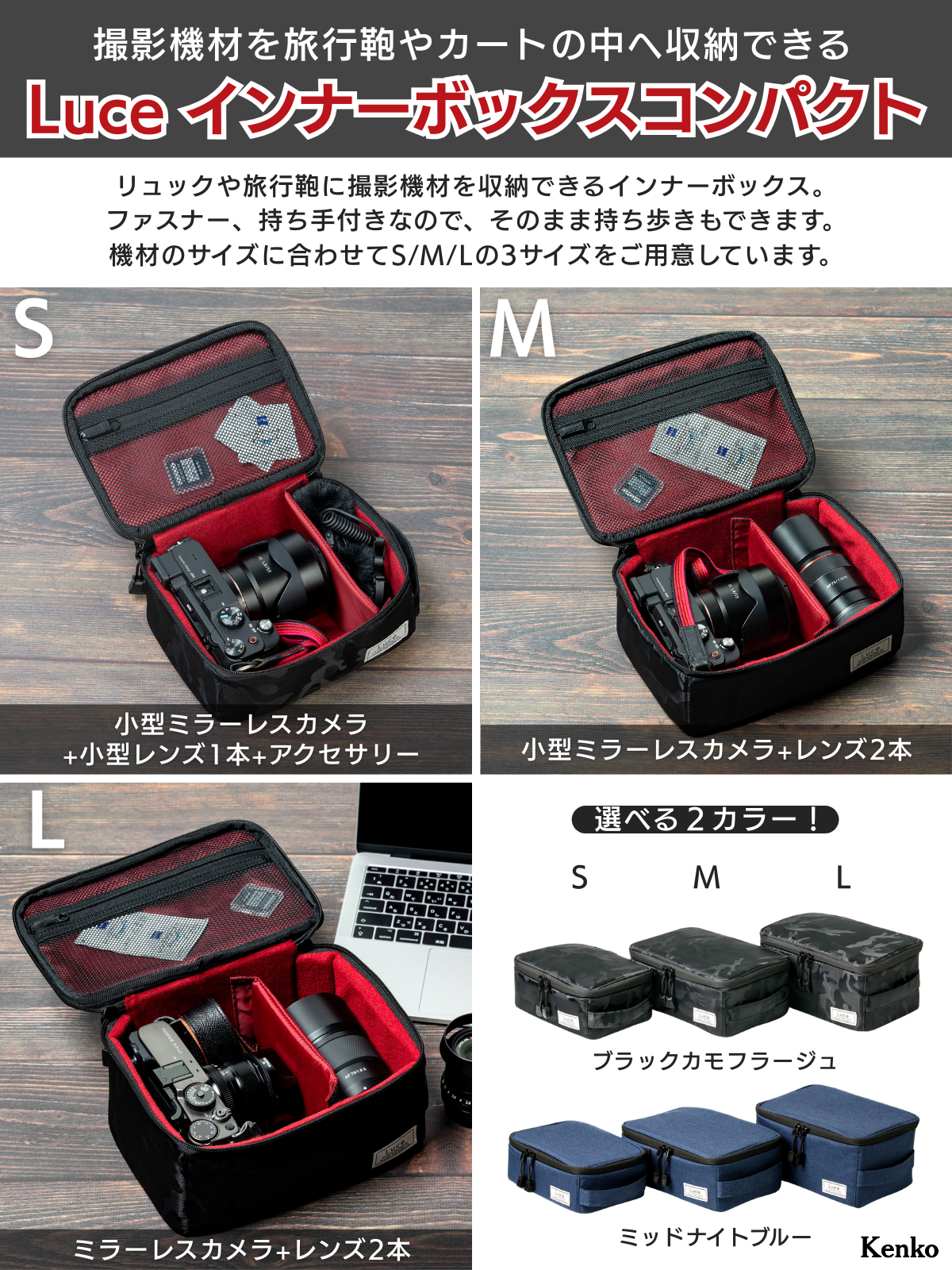 撮影機材を旅行鞄やカートの中へ収納できる、ファスナー付きインナーボックスです。Sサイズは小型ミラーレスカメラ+小型レンズ1本+アクセサリー、Mサイズは小型ミラーレスカメラ+レンズ2本、Lサイズはミラーレスカメラ+レンズ2本を収納できます。