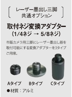 市販カメラ用三脚に、レーザー墨出し器を取付可能にする変換アダプター。A、B、Cの3タイプございます。