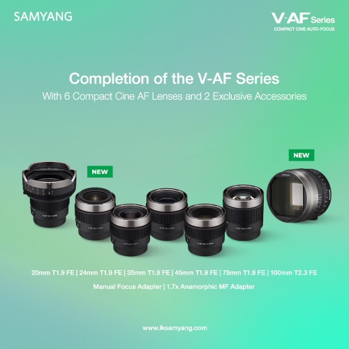 「SAMYANG V-AFシリーズ」は「20mm T1.9」のほかにV-AF 24mm/35mm/45mm/75mm T1.9、100mm T2.9と多彩な焦点距離でシリーズをラインナップしております。