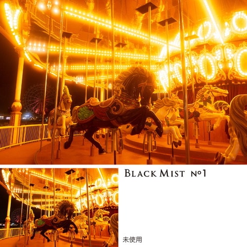「ブラックミスト」は、非常に微細な黒い拡散材を光学ガラスで挟み込んだソフトフィルターです。ハイライトとシャドウ部のコントラストを抑え、柔らかな描写にしたり、独特の光源のにじみが得られます。レタッチなしで、撮ったその場で映画のような雰囲気を得られるのがブラックミストの魅力です。