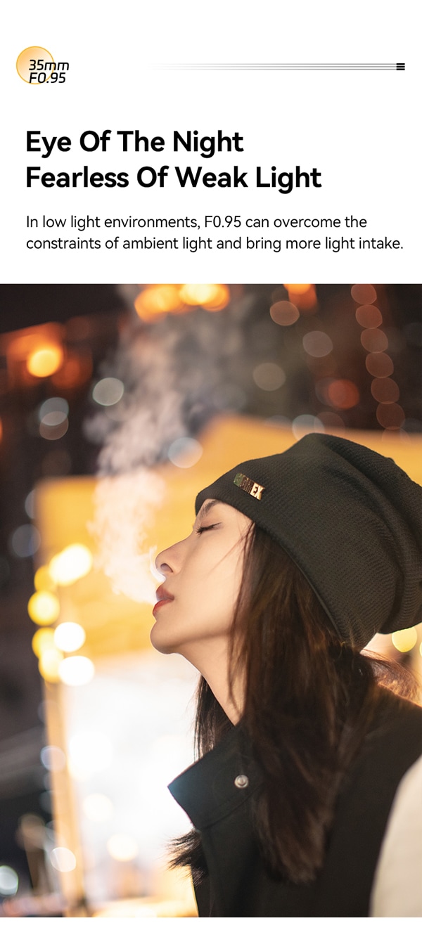 夜の暗い環境の中でも、周囲の光をF0.95のレンズの明るさで、より多くの光を取り込むことができます。