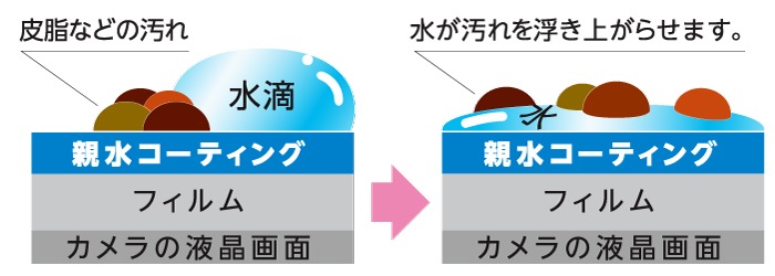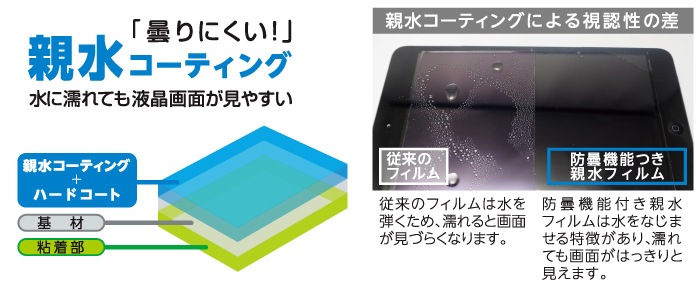 フイルム表面に超親水性機能つき防雲コーティングを施し、曇りにくく、水に濡れた際の液晶画面の見やすさを実現しました。