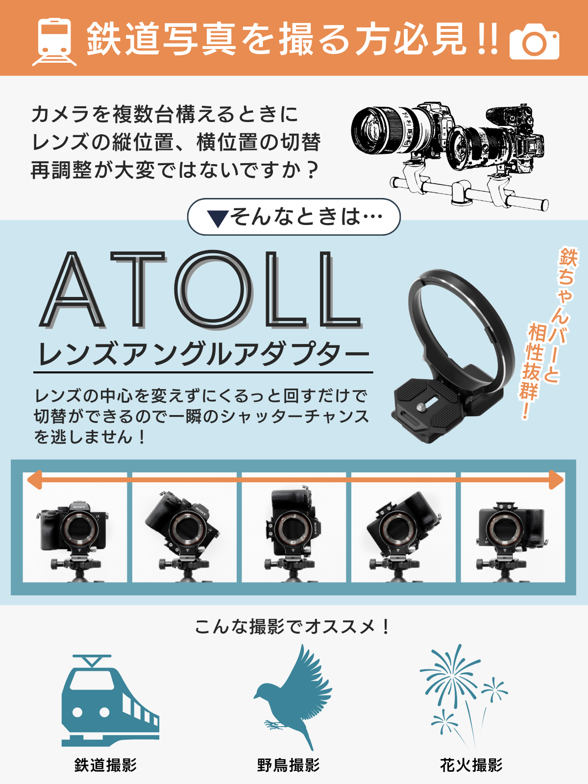 撮影での「縦位置、横位置の変更が面倒」という悩みを解消!L型プレートが進化したカメラ専用二層型回転リング『ATOLL』ついに誕生!