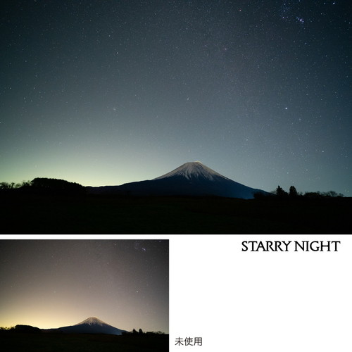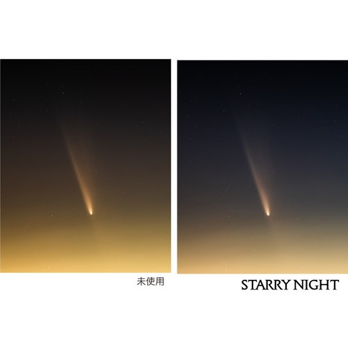●ホワイトバランスはAWB(オートホワイトバランス)で効果が得られます。お好みで色温度を設定したり、蛍光灯モードなどにしてください。●スターリーナイトは光害をカットするため、レンズに入る光量が減少します。スターリーナイトの露出倍数は1/3絞り分です。星空をマニュアル露出で撮影する場合、フィルター無しで撮影した時と同じ設定で撮ると露出アンダーになりますのでご注意ください。