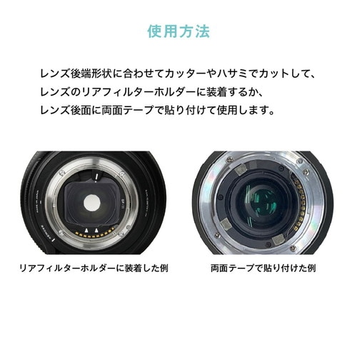 ポリエステル素材のため、レンズ後端形状に合わせてカットして、レンズのリアフィルターホルダーに装着するか、レンズ後面に両面テープで貼り付けて使用します。
