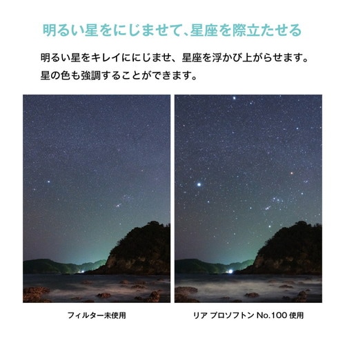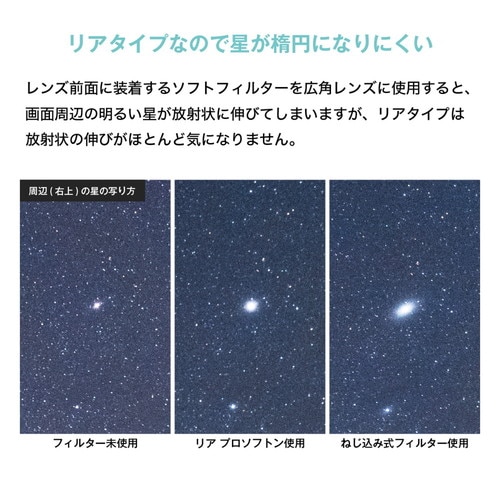リア プロソフトンはレンズのリア(後面)に使用するシートタイプなので、ねじ込み式のフィルターが装着できない超広角レンズでも ご使用いただけます。また、レンズ前面に装着するソフトフィルターを広角レンズに使用すると、画面周辺の明るい星が 放射状に伸びてしまいますが、リアタイプは放射状の伸びがほとんど気になりません。