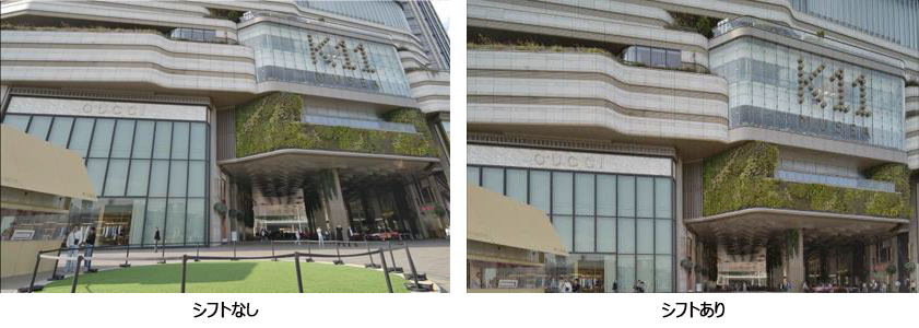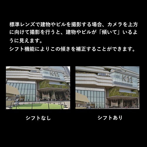 標準レンズで高層ビルを撮影すると、カメラを上方に傾ける必要があるためビルが傾いているように見えますが、シフト機能によりこの傾きを補正することができます。