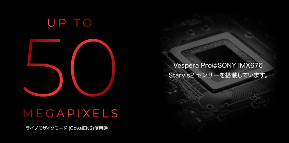 Vespera Proには、最新の STARVIS 2テクノロジーを採用した裏面照射型のSONY製 IMX676センサー (カラー)が搭載されています。このセンサーは大型1/1.6型で一度に広い範囲を撮影するのに適しており、ピクセルピッチは2.0㎛、 3536×3536、約1250万画素の高精細な画像が得られます。