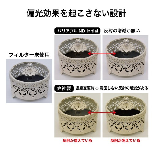 市販の安価帯の可変NDフィルターは、意図しない偏光効果が起きてしまう仕様のものがほとんどですが、「バリアブルND Initial N」は「偏光効果が起こらない設計ですので、安心してお使いいただけます。